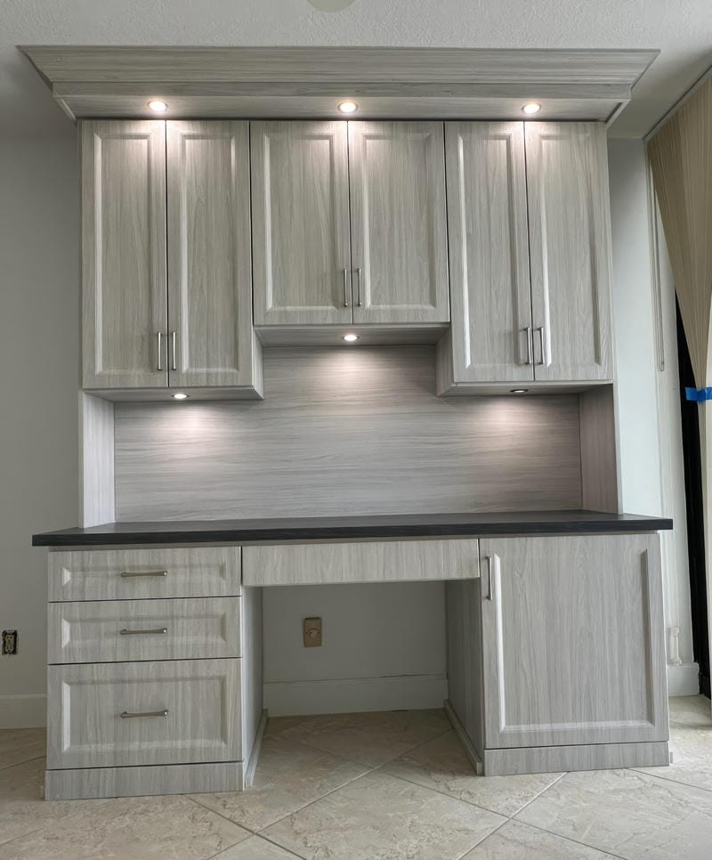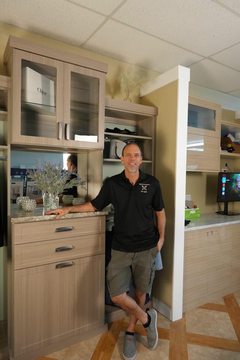 Our cabinet makers build every component in our Jensen Beach shop. Real wood drawer boxes, soft-close hardware, humidity-resistant finishes. Quality control by James Dean personally.